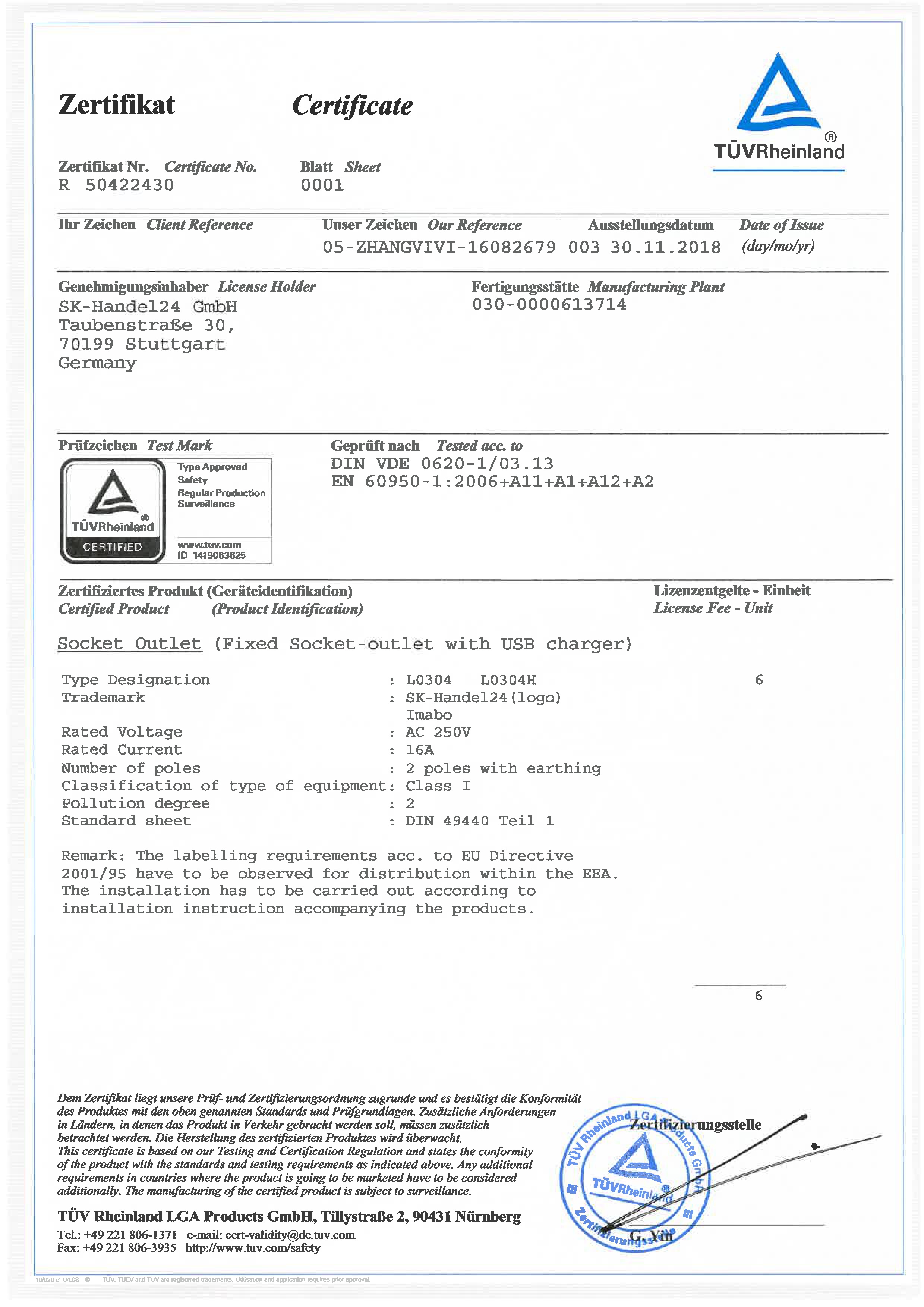 Die USB Steckdosen sind vom TÜV Rheinland zertifiziert (Zertifikatnr.: R50422430). Hierbei wurde nach folgenden Normen geprüft: